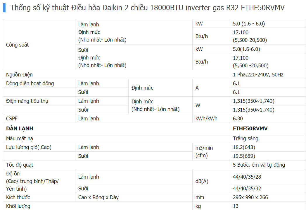 Daikin là thương hiệu điều hòa đến từ xử sở mặt trời mọc. Nó đã không còn là cái tên xa lạ với thị trường điện máy Việt Nam. Với nhà máy sản xuất sở hữu dây chuyền sản xuất hiện đại bậc nhất Đông Nam Á đặt trực tiếp tại Việt Nam, điều hòa Daikin được đánh giá là một trong những dòng điều hòa được nhiều người tiêu dùng lựa chọn nhất. Điều hòa Daikin 18000BTU 2 chiều Inverter FTHF50RAVMV là mẫu điều hòa thế hệ mới trong năm 2020 của Daikin. Nó hứa hẹn là một sản phẩm chiều lòng cả những vị khách khó tính nhất.
