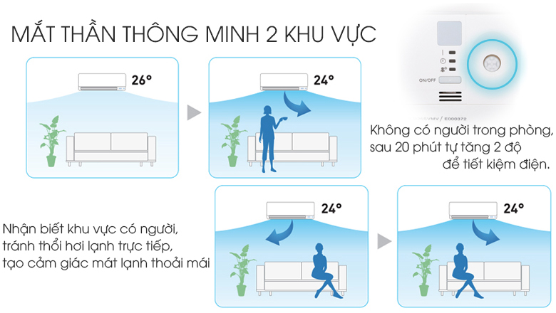 Ngoài ra, chức năng mắt thần thông minh hai khu vực sử dụng cảm biến hồng ngoại giúp bạn kiểm soát luồng gió hướng ra xa hoặc thổi trực tiếp vào người một cách dễ dàng.